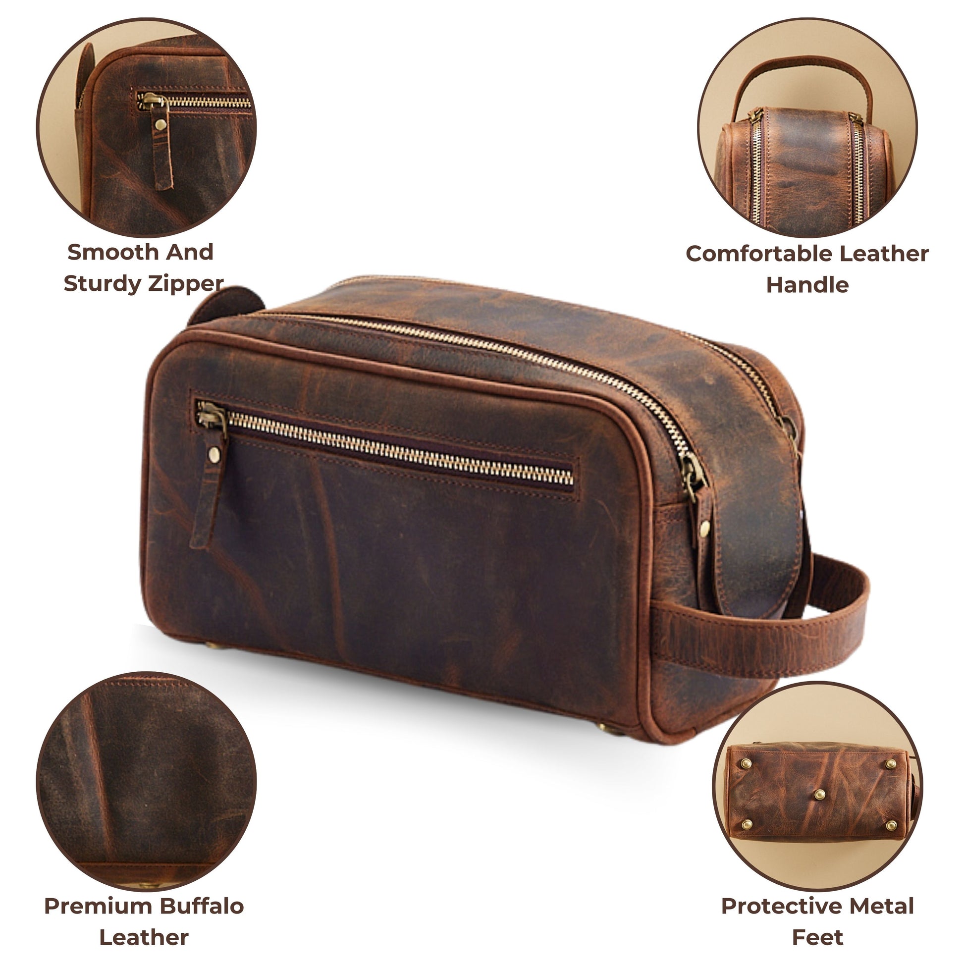 - DURABLE ELEGANCE WITH PREMIUM FEATURES: Our men's toiletries bag features high-end YKK metal zippers, antique brass fittings, and a sturdy leather strap handle. A functional and stylish leather bag for men and women, perfect for travel essentials.