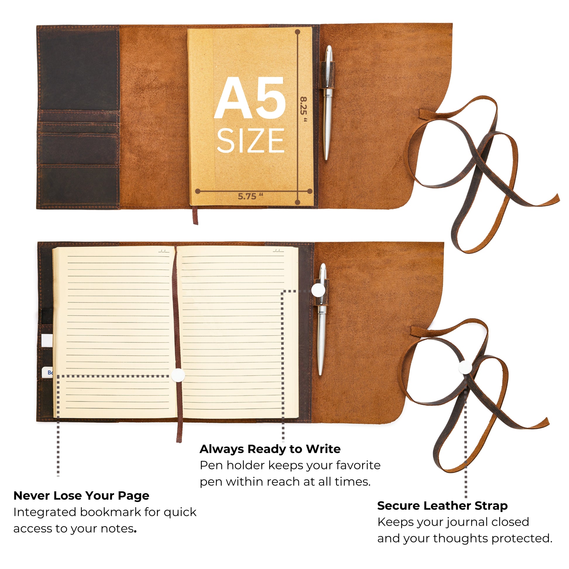 - Premium Leather Journal for Men Women - Refillable Leather Notebook Cover with Pen - Leather Bound Notebook Lined Paper A5, Travel Journal - Ideal for Writing, Journals, and Notebooks